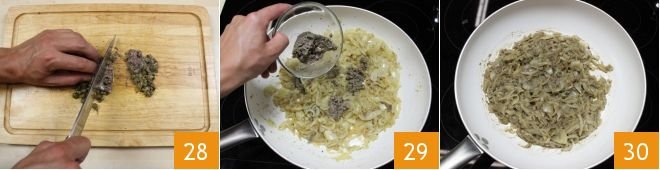 When the onions are almost done cooking, place the capers, already drained and squeezed, on a cutting board along with about 50g of the total amount of salted anchovies that you have desalted and cleaned. Chop 28 and, after turning off the heat, add the chopped mixture to the onions 29. Mix well to combine the ingredients and let cool in the pan 30.
