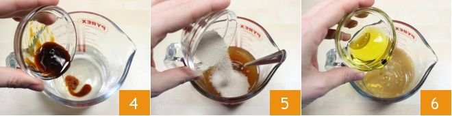 Then dissolve the malt (or sugar) in the remaining water 4, the dehydrated brewer's yeast 5 (or alternatively 8g of fresh yeast) and add the extra virgin olive oil 6.