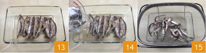 Now focus on desalinizing the salted anchovies, which are headless: place the anchovies in a bowl 13 and rinse them repeatedly under cold water to remove the salt 14. Drain them with a colander 15 and leave them to soak in cold water for 2-3 hours, frequently changing the water. Perform this operation very gently to avoid the anchovies breaking apart.
