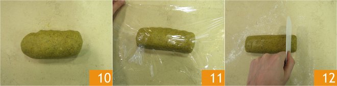 Form a dough ball 10, wrap it in plastic wrap 11, and put it in the fridge to rest for about 1 hour. After the necessary time, take the dough from the fridge and cut pieces of about 0.7 oz (20 g) with a dough scraper 12.