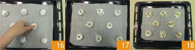 place them on a baking sheet lined with parchment paper. Space them a little apart because they will puff up during baking. At this point, make a slight finger pressure on each ball 16 to flatten them slightly. Insert a whole pistachio on each cookie 17 and bake in a preheated static oven at 350°F for 15 minutes, on the middle rack. Once baked, remove the pistachio cookies from the oven 18 and let them cool to room temperature before enjoying them.