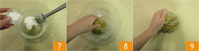 and the baking powder, a little at a time, continuing to mix with the spatula 7. When the dough starts to become fairly solid, begin to work it with your hands 8, moving it to the workbench 9.