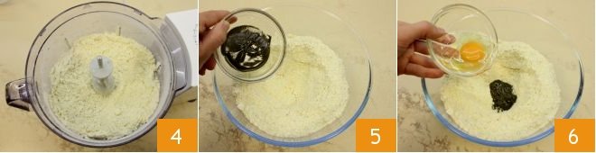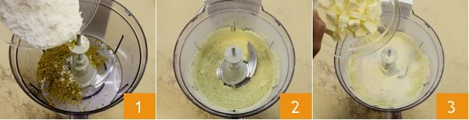 create the crumble by pulsing the blades for a few moments 4. Pour the crumbly mixture into a bowl, add the pistachio paste 5 and the egg 6.