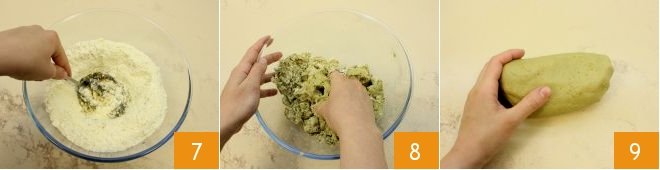 start mixing the ingredients with a fork 7, then quickly knead with your hands 8 and transfer the now more compact mixture to a work surface. Handle it just long enough to form a dough ball 9.