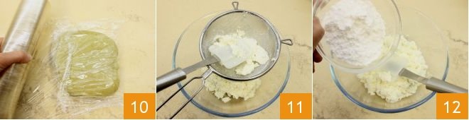 Then flatten it slightly and wrap it in plastic wrap 10; then put it in the refrigerator for at least half an hour or until it is firm. In the meantime, focus on the filling: take the sheep ricotta (which you have drained overnight or at least 2 hours in a colander in the refrigerator covered with plastic wrap), sift it to make it creamier 11, and then add the powdered sugar 12. Cover with cling film in contact and put the cream in the refrigerator to rest while you continue with the preparation.