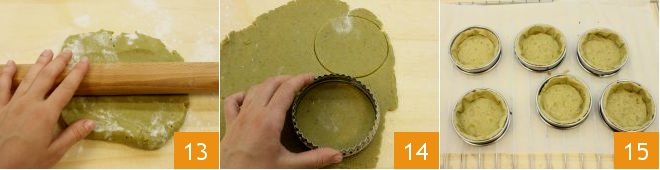 Take the shortcrust pastry and roll it out into a disk 4-5 mm thick 13; take a 4-inch diameter pastry cutter and make 13 disks 14 that you can place inside 2.75-inch diameter molds with a side about 0.6 inches high, also lining the edges 15. Place the tartlets in the refrigerator to firm up for another 30 minutes.