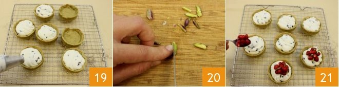Fill the now cold tartlets 19, then wash the wild strawberries and slice the pistachios for the final decoration 20; place the wild strawberries in the center of the tartlets 21