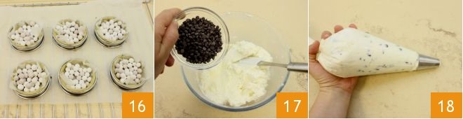Then prick the bottom with a fork's tines and line all the tartlets with parchment paper disks; place ceramic weights (or legumes like beans) to proceed with blind baking 16 in a preheated static oven at 338°F for 15 minutes (if ventilated, 300°F for 5-10 minutes). After the necessary time, remove the weights and continue baking for another 5 minutes to let the pastry dry well. Once cooked, remove the tartlets from the oven and let them cool completely on a rack. Take the cream from the refrigerator and add the chocolate chips 17, then transfer the cream to a pastry bag with a 0.4-inch wide smooth tip 18.