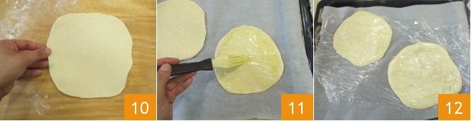 then roll it out with a rolling pin until you get sheets about 8 inches in diameter, with a thickness of about 1/16 inch 10. Place the obtained sheets on a baking tray lined with parchment paper, brush them with an emulsion of oil and water 11, cover with plastic wrap 12 and let them rise for at least 40 minutes, again in the oven off with the light on. For more information on preparing Pita, you can consult the recipe on our website.