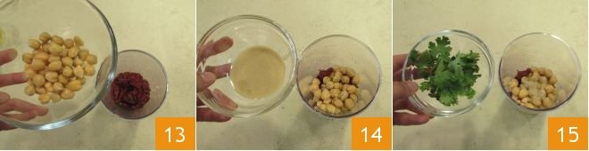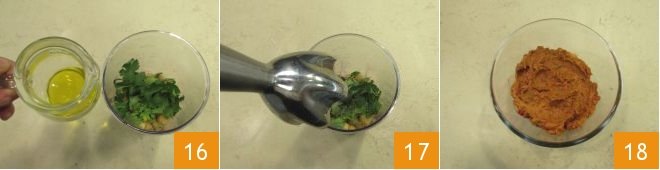 In the meantime, you can prepare the sun-dried tomato hummus: place the sun-dried tomatoes in a tall, narrow container, add the chickpeas 13, the tahini 14, the coriander previously washed and dried 15,