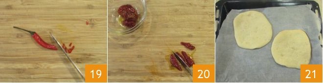 After the pita rising time, spray them with a little water and bake them in a preheated static oven at 482°F for 8 minutes on the middle shelf. Meanwhile, wash and finely chop the chili 19 and cut the other sun-dried tomatoes into strips 20. When the pita is cooked 21, you can fill them with the ingredients you have prepared: