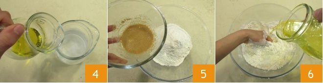 and the oil 4 and mix well. Now sift the flour into a large bowl, add the water with the yeast 5 and start kneading with your fingertips. Then, without stopping kneading, pour in the water with oil and salt 6 in a thin stream and continue working until you get a well-blended dough.