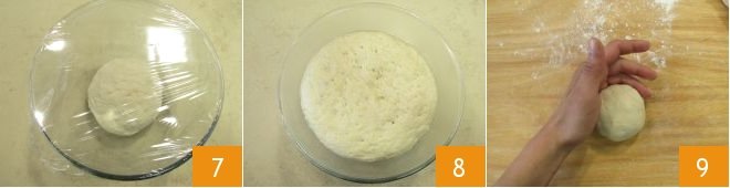 At this point, transfer the dough to a work surface and shape it into a ball, which should have a nice smooth and elastic texture. Place the formed dough in an oiled bowl, cover with plastic wrap 7 and let it rise in the oven off with the light on for about 2 hours or until it has doubled in size. After the rising time 8, transfer the dough to a lightly floured work surface and divide it into 4 portions each weighing about 3.5 oz. Shape each portion into a ball 9,