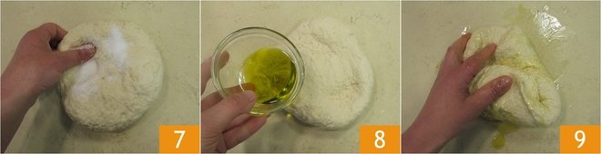 When you have a homogeneous mixture, add the salt and knead again to incorporate it 7. Finally, add the oil in 2 or 3 additions 8, working until fully absorbed 9.