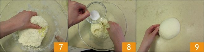 while kneading with your hands 4. Once all the water has been added and the dough begins to take shape 5, pour in the oil in a thin stream 6,