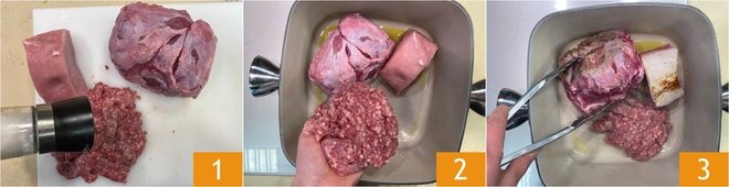To make plin ravioli with brown sauce, first prepare the Beef Broth that you will need to cook the filling. For the filling: heat a generous drizzle of oil in a large casserole, preferably cast iron, suitable for oven cooking as well. Pat dry the beef, pork loin, and sausage, from which you removed the casing, then lightly salt them 1. Place the meat in the casserole with the hot oil, being careful to compact the sausage meat between your hands to flatten it 2. Let the pieces of meat brown over high heat for 3-4 minutes without touching them; when one side is well colored, turn them with kitchen tongs and continue this way until all sides are well browned 3.