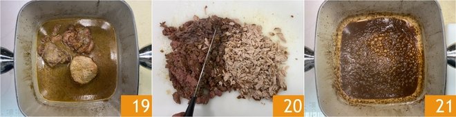 At the end of the cooking time, check that the meat is soft enough to fall apart with a spoon 19, then transfer it to a cutting board and finely chop it with a knife 20. Keep the cooking juices in the casserole and put it back on the heat; bring to a boil and let reduce until you obtain a very thick consistency 21.