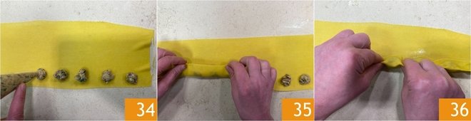 When you have obtained a sheet of dough 1 mm thick, lay it on the work surface and squeeze small mounds of filling about 1 cm from the edge, spacing them a couple of cm apart 34. Gently fold the sheet over itself 35 and pinch with your fingers at the sides of the filling to obtain the classic 'plin' shape, taking care to remove the air inside 36.