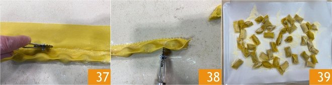 Use a pasta cutter to first cut the strip of ravioli 37 and then to separate them individually 38; this way, a sort of outer 'pocket' will form to hold the seasoning. Proceed in this way with the second portion of dough and place the obtained ravioli on a tray dusted with semolina 39.