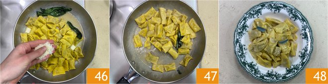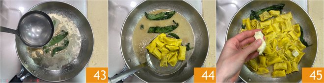 Add a ladleful of the ravioli cooking water 43 and stir briefly: this way, you have obtained brown butter. When the ravioli rise to the surface, drain them and transfer them to the pan 44, then toss everything for a minute. Turn off the heat and finish with the cold butter 45.