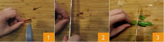 To prepare the poke temaki wrap, take the chili pepper and remove the stem. Then remove the seeds inside 1 and chop it 2. Finely chop the green part of the scallion as well 3.