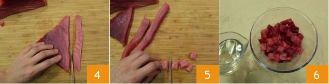 Take the fresh tuna (make sure it has been flash-frozen upon purchase and follow the instructions at the end of the recipe for proper use and consumption of raw fish); first cut it into strips 4, then into 3/4-inch cubes 5, and place them in a small bowl. Dress with sesame oil 6,