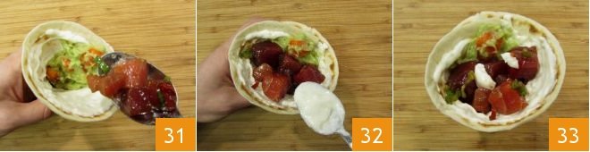 and add it to the flatbread 31, then garnish to taste with some crescenza cheese 32 and continue until the ingredients are used up. Your poke temaki wrap is ready to be served 33!