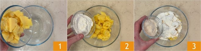 To prepare the polenta gnocchi, start by gathering cold, well-dried polenta cut into pieces in a bowl. 1. Add the flour 2 and the grated cheese 3.