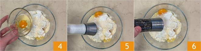 Add the egg 4, then season with salt 5 and pepper 6.