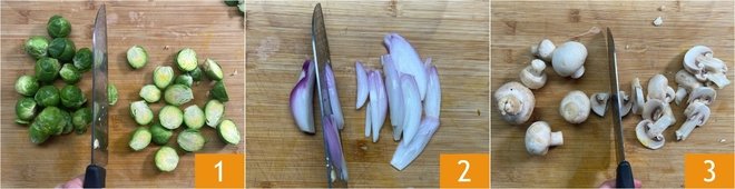 To make the polenta pizza, first prepare the vegetables: clean the Brussels sprouts and cut them in half 1, then peel the shallot and slice it 2. Remove the earthy base of the champignon mushrooms and also slice them 3.