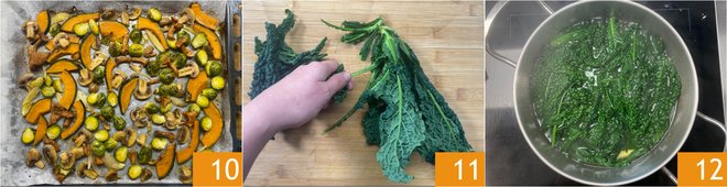 Place the vegetables on a baking sheet lined with parchment paper and cook in a preheated static oven at 428°F for 20-25 minutes 10. Meanwhile, prepare the black kale cream: remove the central rib from the black kale leaves 11, then blanch them for 3-4 minutes 12.