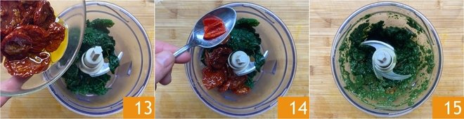 Drain the black kale and transfer to a blender, then add the sundried tomatoes with their oil 13 and the chili pepper 14. Blend until you have a creamy consistency and set aside 15. Slice the mozzarella and place it in a colander to drain excess water.