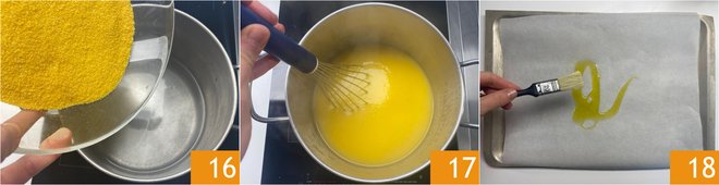 To prepare the polenta, bring a pot of water to a boil with 3 teaspoons of salt, then sprinkle in the cornmeal 16. Cook for the time indicated on the package, stirring with a whisk 17. Grease a baking sheet lined with parchment paper with oil 18.