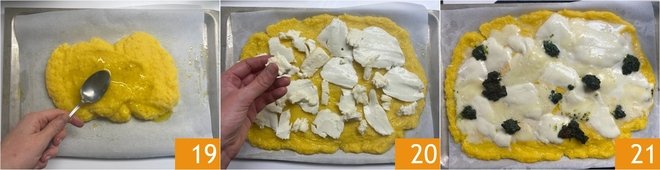 Once ready, pour half of the polenta onto the baking sheet (the amount is for 2 trays) and level it with the back of a spoon, using a little oil if necessary 19. Top with half of the sliced mozzarella and half of the taleggio cheese in pieces 20, then add dollops of black kale cream. Bake in static mode at 410°F for 10 minutes, then remove from the oven and let rest for a few minutes. Switch to grill mode and bake again for 2 minutes to gratinate the cheese 21.