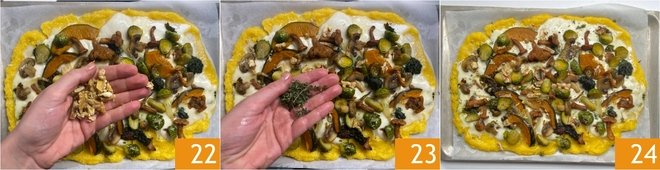 At this point, remove from the oven and distribute half of the vegetables, then garnish with walnuts 22 and thyme 23. Place the baking sheet back under the grill for 3-5 minutes, then finish with a grind of pepper. Proceed in the same way to prepare the second tray and serve your polenta pizza hot 24!
