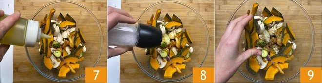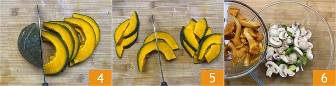 Wash the pumpkin and slice it thinly without peeling 4, then further halve the slices 5. Gather all the ingredients in a bowl and also add the chanterelles, which you have gently cleaned with a damp cloth 6.