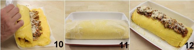 Using the parchment paper, immediately start rolling the polenta while it is still hot 10 until it forms a cylinder that you will close with parchment paper 11 and let rest for a few minutes with the end facing down, before placing it in an oiled baking dish with a tablespoon of extra virgin olive oil. Before baking, sprinkle the top of the roll with the sausage mixture, sprinkle it with a tablespoon of grated cheese 12 and bake the polenta roll in a preheated oven at 392°F for about 20-25 minutes. After the necessary time, take the polenta roll with sausage and mushrooms out of the oven, let it rest for 10 minutes, and then serve it by cutting it into slices.