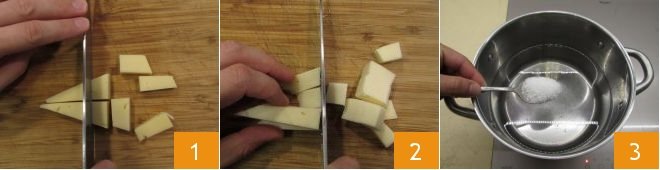 To make polenta concia, start by cutting the fontina 1 and the toma 2 into cubes. Then put a thick-bottomed steel pot on the fire, pour in the water and heat it. When it starts to reach a boil, add the salt 3,