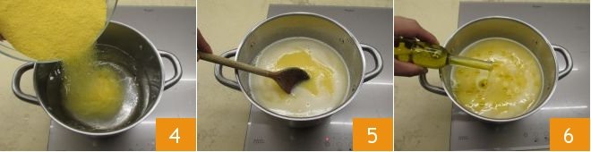 pour in the flour in a fine stream, stirring with a wooden spoon 4. Keep cooking at high temperature while stirring quickly 5. Add the olive oil to prevent lumps from forming 6. Continue cooking for 50 minutes over low heat, stirring constantly to prevent the polenta from sticking to the bottom.