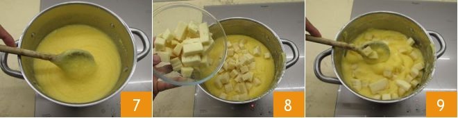 Five minutes before the end of cooking 7, salt and add the cheese pieces 8 and stir to melt them 9.