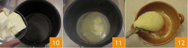 Meanwhile, put the butter in a pan 10 and melt it over low heat 11. When the polenta is ready and the cheeses inside have melted well, pour it into terracotta bowls 12 that will keep the dish warm.