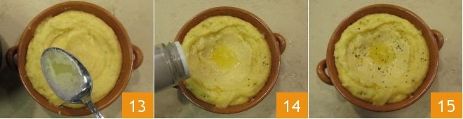 With the back of a spoon, make a well in the center of the polenta and pour the melted butter here 13. Season with pepper to taste 14 and serve your polenta concia piping hot 15.