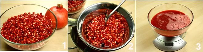 To prepare pomegranate jelly, start by sanitizing the jars and lids, as indicated in the guidelines from the Ministry of Health at the end of the recipe. Then take a large container and peel the five pomegranates, ensuring to remove all yellow parts and peels as they are bitter 1. Pass the seeds through a food mill 2. From the five pomegranates, you should obtain about 30 oz of juice 3.