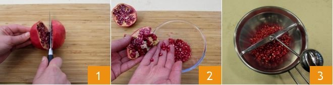 To prepare the pomegranate risotto with leek cream, start by preparing the Vegetable broth, then deseed the pomegranate: use a knife to cut the fruit in half 1, then remove the seeds 2 and set aside about 0.7 oz for the final decoration. The rest can be pressed with a food mill to collect the juice in a small bowl 3.