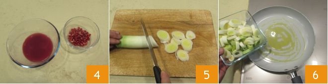 Set aside the pomegranate juice and whole seeds 4. Then proceed to prepare the leek cream: remove the green part and the roots of the leek, peel off the first layer, and slice it 5. In a pan, pour the oil, heat it, and add the leek to let it soften over low heat 6