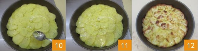 season again with salt and pepper and a little melted butter 10. Continue layering until all the potatoes and melted butter are used up, always seasoning with salt and pepper 11. Now turn off the heat and transfer the pan to a preheated static oven at 390°F for 30 minutes, (or in a convection oven at 355°F for 20 minutes) then switch to grill mode for 3 minutes or just enough time to brown the surface. Once cooked, take the pan out of the oven 12