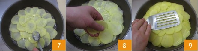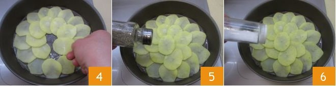 then, still keeping the heat moderate, lay the potato slices on the bottom 4 creating a concentric circle pattern: the potatoes should be very close to each other, slightly overlapping, so they adhere well to the bottom of the pan. Once the first layer is finished, season with pepper 5 and salt to taste 6;