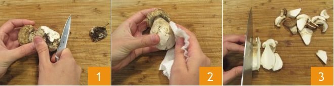 To make porcini mushroom risotto, first prepare the vegetable broth. Then clean the mushrooms: remove the base with a knife, scrape the stalk to remove any soil residue, then rub gently with a damp cloth. If some of the mushrooms have too much soil residue, pass them under a stream of running water, but be sure to dry them immediately to prevent them from absorbing water. Cut the mushrooms into slices approximately 1/4 inch (7-8 mm) thick, keeping the whole section intact where possible 3.
