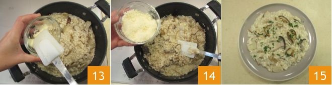 Once cooked, stir the risotto over low heat, adding the butter 13 and grated Parmesan cheese 14, and mix well. If you prefer a less dry risotto, add another ladle of broth. Garnish with fresh chopped parsley, and your porcini mushroom risotto is ready to be served 15!