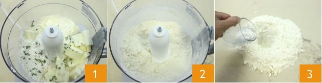 To prepare the porcini mushroom strudel, start with the shortcrust pastry: place the flour, cold butter cut into pieces, a pinch of salt, and thyme leaves in a mixer 1. Then blend for a few seconds until you get a sandy mixture 2. At this point, transfer the mixture to a clean work surface and form the classic fountain shape in the center. Start kneading by gradually pouring in the water 3.